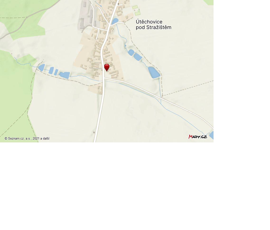 Rodinný dům katastrální území Útěchovice pod Stražištěm, obec Útěchovice pod Stražištěm, okres Pelhřimov, kraj Vysočina je postaven jako samostatně stojící na vlastním pozemku. Vstup do objektu z jižní strany z předzahrádky. Dům je obdélníkového půdorysu. Dům je zastřešen sedlovou střechou, hřeben střechy kolmý ke komunikaci. Dům má 1.NP a pod střechou je půda. Dům není podsklepený. V domě je bytová jednotka o dispozici 2+1, podlahová plocha cca 80 m2. Je zavedena elektřina, vodovod, odpady svedeny do jímky, plyn není. V objektu sídlila místní knihovna, nyní není obydlen, je prázdný.Rodinný dům je proveden jako stěnový systém zděný. Dům je postaven na základech z kamene. Stropní konstrukce pravděpodobně dřevěné trámové. Zastřešení sklonitou sedlovou střechou, krytina pálená taška. Klempířské konstrukce chybí okapy, žlaby a svody. V objektu je komín. Omítky vnitřní vápenné dvouvrstvé. Rozvody elektroinstalace, vody, odpadů, elektroinstlace. Vnější omítka hladká vápenná, značně poškozená vlhkostí. Okna dřevěná dvojitá. Vnější dveře dřevěné. Technický stav nemovitosti: před kompletní rekonstrukcí, nyní objekt neobydlen.